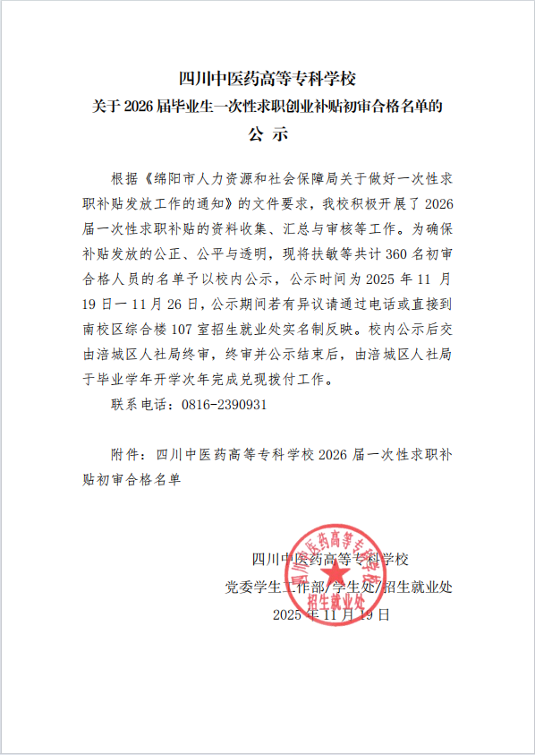 关于2026届毕业生一次性求职创业补贴初审合格名单的公示